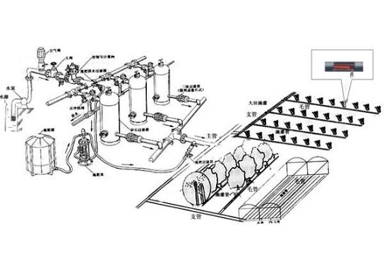 完整的滴灌系統(tǒng)包括:水源部分、首部驅(qū)紐、輸配水管網(wǎng)、和滴水器4部分組成,如上圖所示。1、水源部分:常見的水源有江河、湖泊、井泉水、坑塘、溝渠、水庫、地下水和混合水均可作為滴灌水源;2、首部驅(qū)紐:是整個(gè)滴灌系統(tǒng)操作控制的中心,與水源工程相結(jié)合,其作用是對滴灌系統(tǒng)提供恒定、潔凈滿足滴灌要求的水,是系統(tǒng)的動(dòng)力和流量源。如圖所示,包含水泵、控制閥、測量控制儀表、施肥裝置、過濾系統(tǒng)(作用是除去水源中的雜質(zhì),防止滴頭堵塞)。3、輸配水管網(wǎng):是將首部驅(qū)紐處理過的水按照要求輸送、分配到每個(gè)灌水單元和灌水器。如圖...
