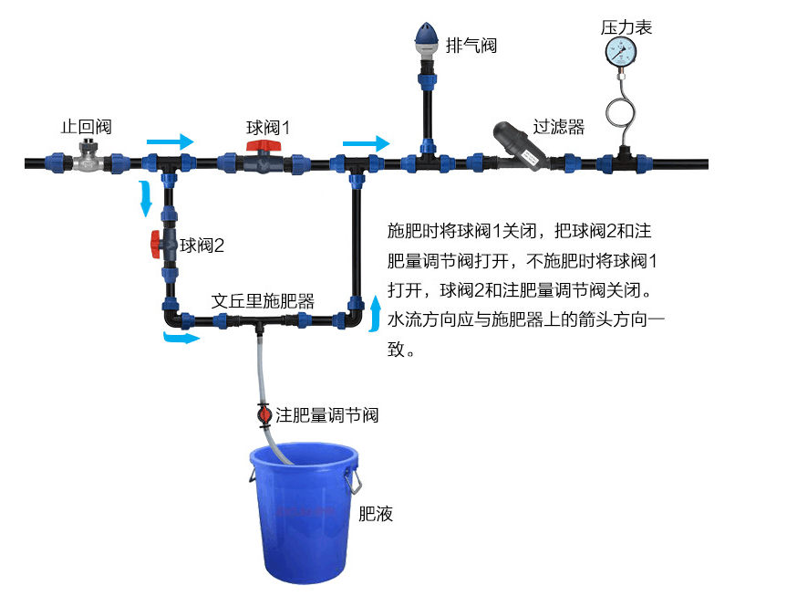 2.施肥量控制:施肥時(shí)要掌握劑量,注入肥液的適宜濃度大約為灌溉流量的0.1%。例如灌溉流量為50m3/畝,注入肥液大約為50升/畝;過量施用可能會(huì)使作物致死以及環(huán)境污染。