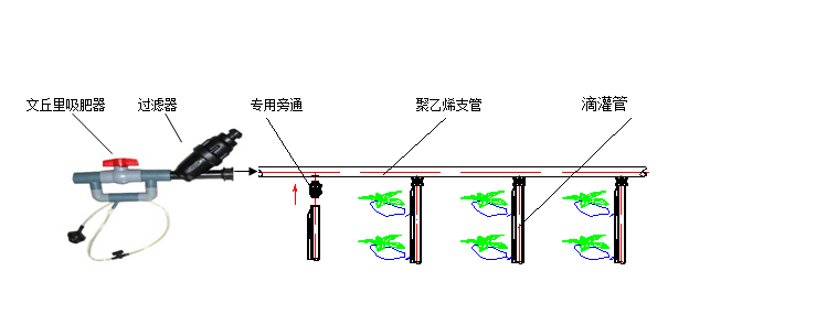 4. 文丘里施肥器: 是由閥門、文丘里、三通、彎頭連接而成,體積小,結(jié)構(gòu)簡(jiǎn)單。施肥時(shí),適當(dāng)關(guān)小球閥,讓水部分從施肥器中流過(guò),吸肥器開始吸肥。