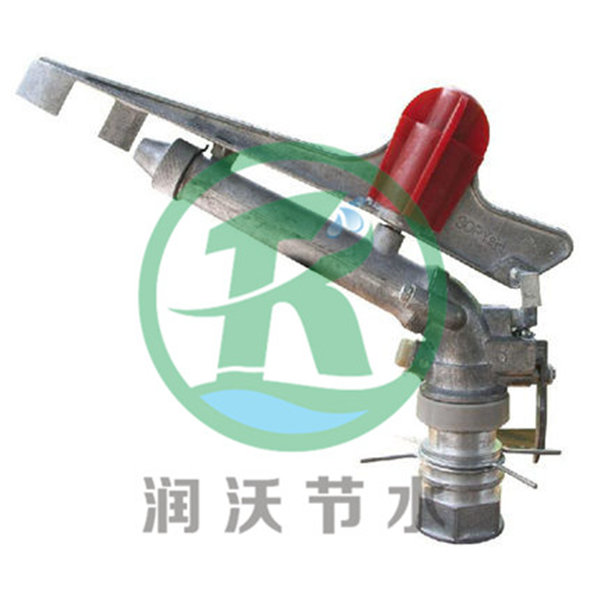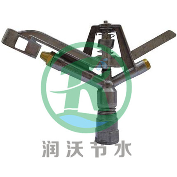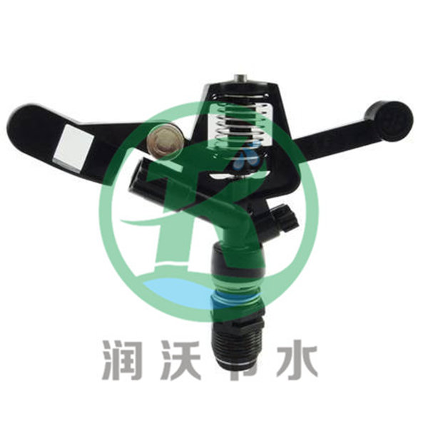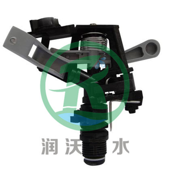 它是在噴管上方的搖臂軸上,套裝一個前端設有偏流板(擋水板)和導流板的搖臂壓力水從噴管的噴嘴中噴出時,經(jīng)偏流板沖擊導流板,使搖臂產(chǎn)生切向運動力繞懸臂回轉一角度,然后在扭力彈簧的作用下返回并撞擊噴管,使噴管轉一角度,如此反復進行,噴頭即可作全圓周轉動。如在噴頭上加設限位裝置和換向機構,使噴管在轉動一定角度后換向轉動,即可進行扇形噴灌。適用于固定式中壓噴灌系統(tǒng)。垂直擺臂式噴頭 利用水流沖擊垂直擺臂前端的導流器時產(chǎn)生的反作用力使噴頭作間歇旋轉運動,擺臂靠其后端的配重回轉。噴頭轉動一定角度后,靠軛架滾輪與限位器配合通過傳動桿推拉噴嘴前方的反轉臂,使其切入或離開噴嘴射流,迫使噴頭迅速反轉。這種噴頭具有受力均衡、工作平衡可靠、射程較遠、流量調(diào)節(jié)范圍大等優(yōu)點,使用日益廣泛。但所需壓力較高,結構較復雜。