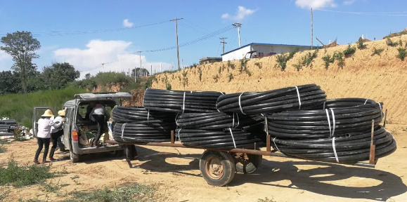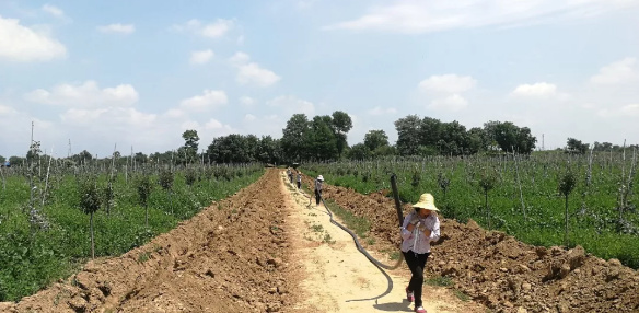 田間管網(wǎng)自過濾間經(jīng)過濾器、施肥后引出,管網(wǎng)包括主干管、干管、分干管、支管、毛管,主干管和干管沿道路布置,分干管根據(jù)地形,沿田坎布置,支管與蘋果苗木種植方向垂直(或成一定角度)布置,毛管沿蘋果苗木種植行布置。毛管經(jīng)方案優(yōu)選選用Φ16PE內(nèi)鑲式滴灌管,材質(zhì)為PE,鋪設(shè)于地面;支管為PE管,鋪設(shè)于地面,主干管、干管、分干管均采用PVC-U管。